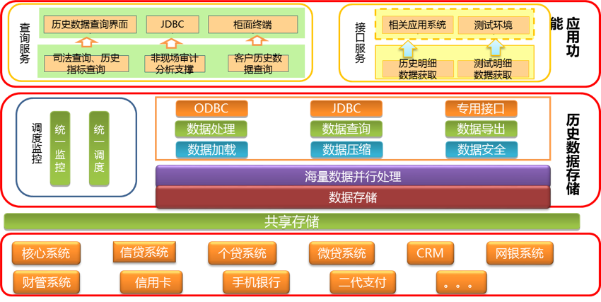该平台全方位覆盖银行企业内外部、多样异构的海量数据存储,提供历史数据快速检索查询功能,提高公检法、非现场审计等应用的查询效率,支持长时间跨度历史数据的高性能查询,最终实现“核心减负”。