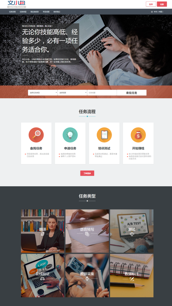 除了面向B端客户提供全球数据众包解决方案,“文小包”还是一个面向全球C端用户的多语言数据众包任务平台和资源池。目前“文小包”平台网站提供中、英、日三种界面语言,发布语言转写与标注、数据采集与处理、众包测试、众包翻译等在线任务类型,并已实现资源招募、培训评估、质量控制、在线论坛、信誉跟踪、支付管理六大平台功能。
