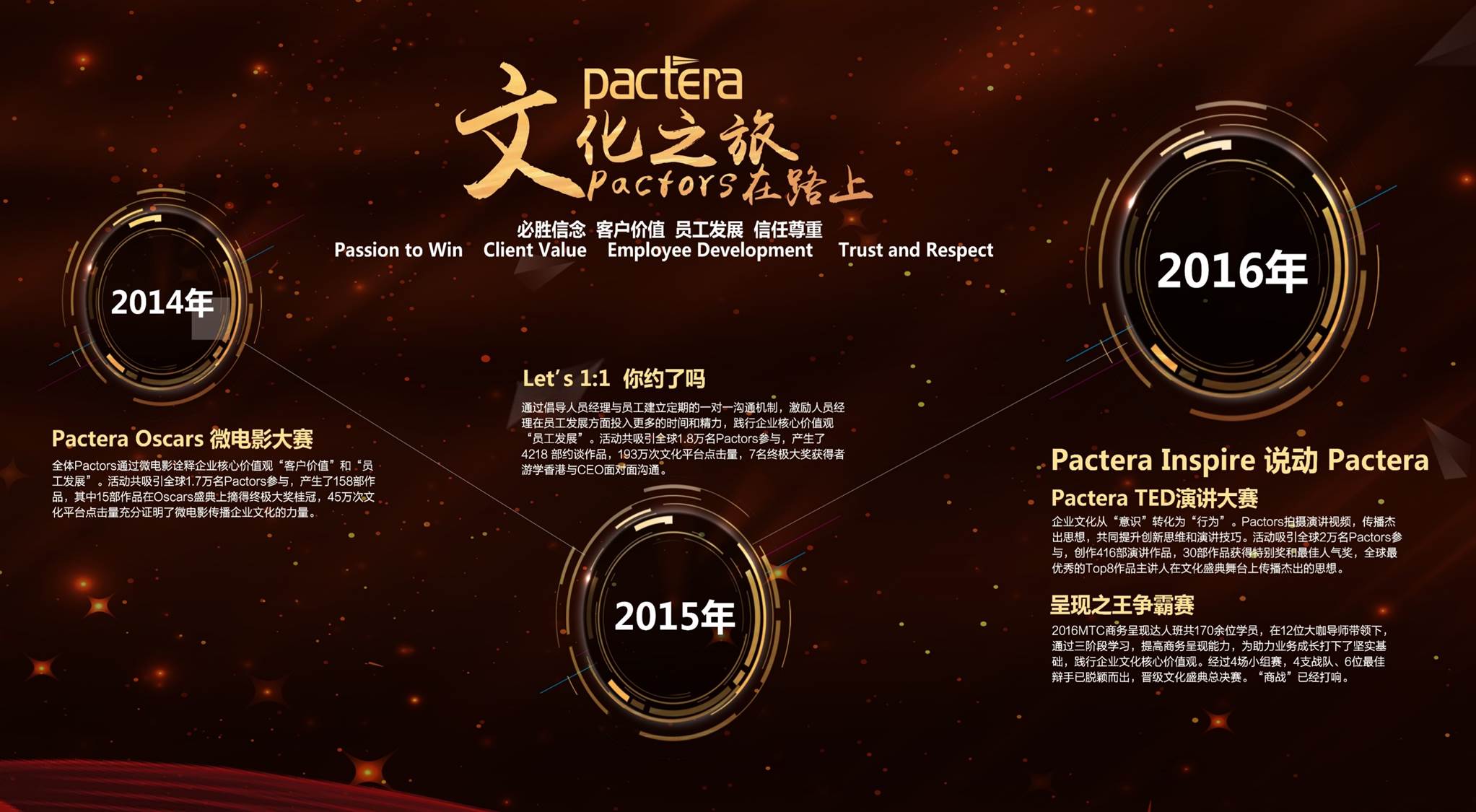 2014年是文思海辉企业文化之旅的起点,对整个文思海辉来说都具有着至关重要的开创性意义。是年,刚刚完成合并、转型的文思海辉重新梳理了企业文化理念,提出文思海辉“必胜信念、客户价值、员工发展、信任尊重”的核心价值观,并通过举办以“客户价值”和“员工发展”为主题的“Pactera Oscars”活动来实践全新理念。文思海辉2万名员工中有1.7万人参与了这项活动,产生了158部参赛作品,其中15部作品在Oscars盛典上摘得终极大奖的桂冠。文思海辉企业文化项目初次试水便大获全胜,文化平台点击量达到45万次。