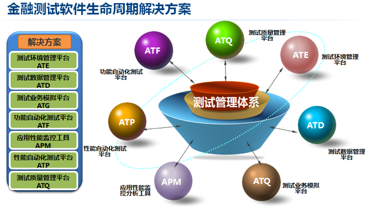 功能自动化测试平台(ATF) 的功能涵盖测试项目管理、自动化持续每日构建、配置管理、变更管理、业务需求整理、自动化测试、测试数据准备方案、过程管理等方面;性能自动化测试平台(ATP)基于Loadrunner等性能测试工具,通过管理平台实现性能测试场景自动制定、测试脚本的自动执行、监控结果数据采集自动化、测试结果的自动分析及测试报告的自动生成。