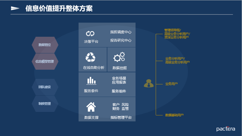 文思海辉·金融经过十多年的数据分析领域研究,总结了一套行之有效的信息价值提升方案,涵盖产品、场景、管控等一系列解决方案,如下图中所示: