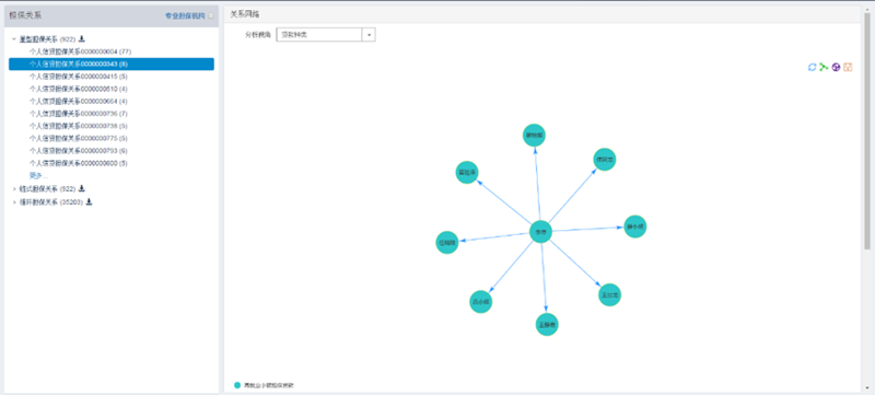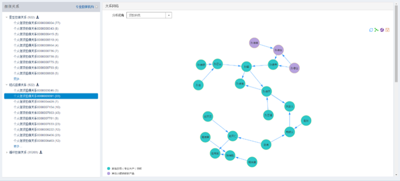 通过深度优先搜索算法对担保关系进行遍历,对联保、互保的特殊结构进行识别,可以直观刻画出担保圈规模边界和特殊的网络拓扑结构,也为谈论担保圈风险的防范和化解提供了技术支持。同时,对于担保圈风险的识别,还包括对于担保圈节点层面以及社群层面的测量体系;通过识别担保圈的风险情况,掌握风险特征,寻找关键企业,定位拆解环节,提高担保圈处置的针对性。通过分析联保互保的特殊结构,利用复杂网络技术将担保圈按其担保链条形态分为链型结构、星型结构、环形结构,这也是文思海辉·金融基于银行担保业务抽象出的特殊担保结构。