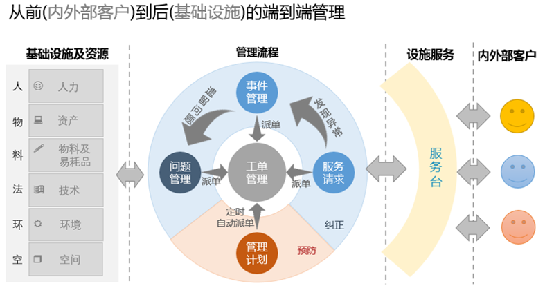 基础设施管理;固定资产管理;易耗品管理;服务订单管理;服务请求管理;管理计划;工单管理;供应商管理;预算管理。