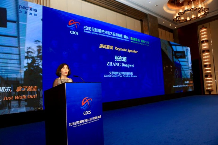 5月23日,2018全球服务外包大会(南通)峰会在南通滨江洲际酒店举办。文思海辉高级副总裁张东蔚女士出席大会,并发表主题演讲《以智赋能,从“智能”到“致用”》。